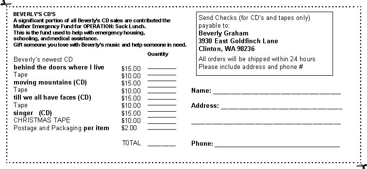 Seven days a week, OPERATION: Sack Lunch is working to meet the needs of the hungry people in our community: preparing meals, fundraising, serving meals, writing grants, educating people…the list goes on. What can you do? Attend our Mother's Day Benefit Concert and Silent Auction. Celebrate mothers with our own founding Mother, Beverly Graham, as she debuts her fourth CD "behind the door where i live". This promises to be a delightful afternoon of entertainment that will also benefit OPERATION: Sack Lunch. If you have not had the opportunity to see and hear Beverly in a live performance (and even if you have), don't let this event pass you by. Beverly's music is an expression of her unique and yet universally human experiences. The music of her latest CD opens a window into the life of a woman who has been mother to three of her own children, and also to the hundreds she has helped to feed for the past twelve years. The intimate concert hall setting of this performance is ideal for Beverly's dynamic voice and heart-felt lyrics. Her tradition for storytelling promises to entertain and inspire. Treat your mom, yourself, your family, and friends on this special occasion. Find details for this event on the cover of this issue of Loaves and Fishes. Specialmusical guests include Emily Afanador, Joe Carolus, Ron Rossel and Ken Wright.