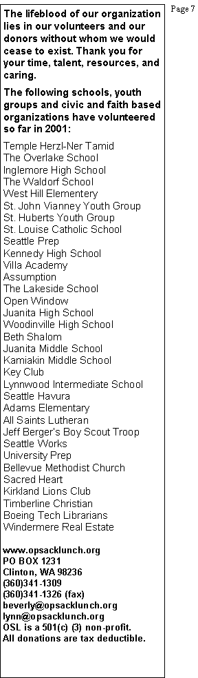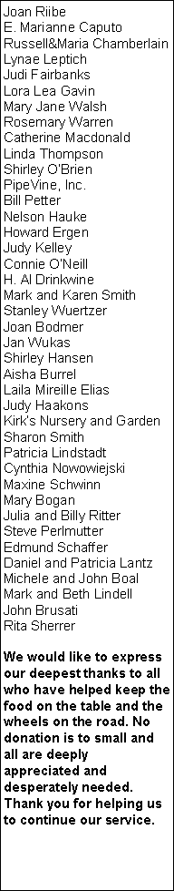 Seattle Foundation Ann Nichols Bladin and Lou Family City of Seattle Kraft Foods Boeing Employees Kennedy High School American Veterans Mary Ann Norton Carl Haefling Pamela Johnson Parishioners of St John Vianney Puget Consumers Co-op Catholic Relief Services: Rice Bowl United Way of King County United Way of Snohomish Delores Zimmerman Pauline White Lake City Presbyterian Leadership for Tomorrow Jay Glerum Bill Petter Boullioun Services Chris Pence Marilyn Ochiltree St Huberts Catholic Church Eddie Graham Doris Hoar Winfield Hutton Tom Volkle Keith Mack Fabio and Elizabeth Gobbo Carolyn Cole Fred Meyers QFC Seattle Works Jerry and Harriet Sramek Genevieve Carlson Laura Stanger Margaret and Peter Berard Lauretta Cluck Carol and Leo Costello Marjorie McQuillan Stephanie Larson J.C. Studley F.B. Gessner Peggy King Anderson Karen Burger Barbara Harrington Susan Peters Alan Mattock Delphine Kettler