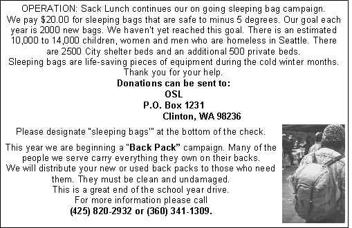 "After spending 20 years in London working for a mental health charity, I moved back to Bellevue and began working for OPERATION: Sack Lunch in the autumn of 1999. These are some of the things I've learned: Being in service to others, particularly those who are most vulnerable in our society is more rewarding then climbing - scrambling up the corporate ladder. Commercial ovens are really difficult to clean. Our volunteers are as diverse and unique as those we serve. Teenagers grasp the injustice and stigma attached to being homeless faster than adults. There are never enough aprons or dish towels. The sizing of food handling gloves bare no relation to human hand sizes. The small act of looking into someone's eyes and saying "hello" can open up a deep connection between two people and reminds me that "difference" is only superficial. And most fundamentally I've learned that one person can make a difference".