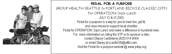 If you would like to volunteer as a Member of the Board, donate time to a Committee, or would like to help with fundraising contact Beverly at (360) 341-1309 or toll free (866) 277-9252. beverly@opsacklunch.org